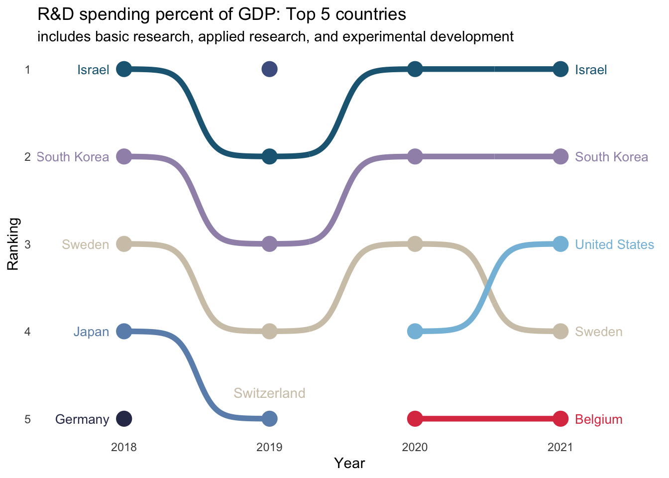It is interesting that Israel and South Korea are clearly in the lead when it comes to investment in R&D as a percent of GDP. The United States only features in the top 5 since 2020.