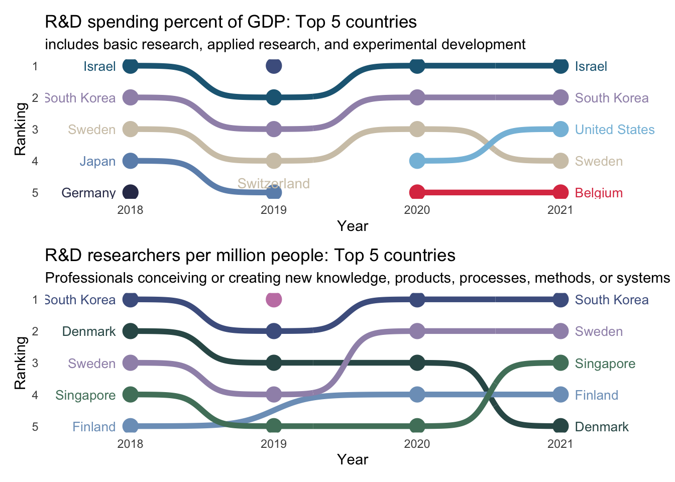 I am most interested in the top5 ranked countries in terms of the percent of GDP they spend on R&D. I group by year and create a new variable that is the rank of the researchers as a function of gdp. I remember to ungroup() the data before arranging by year and rank.