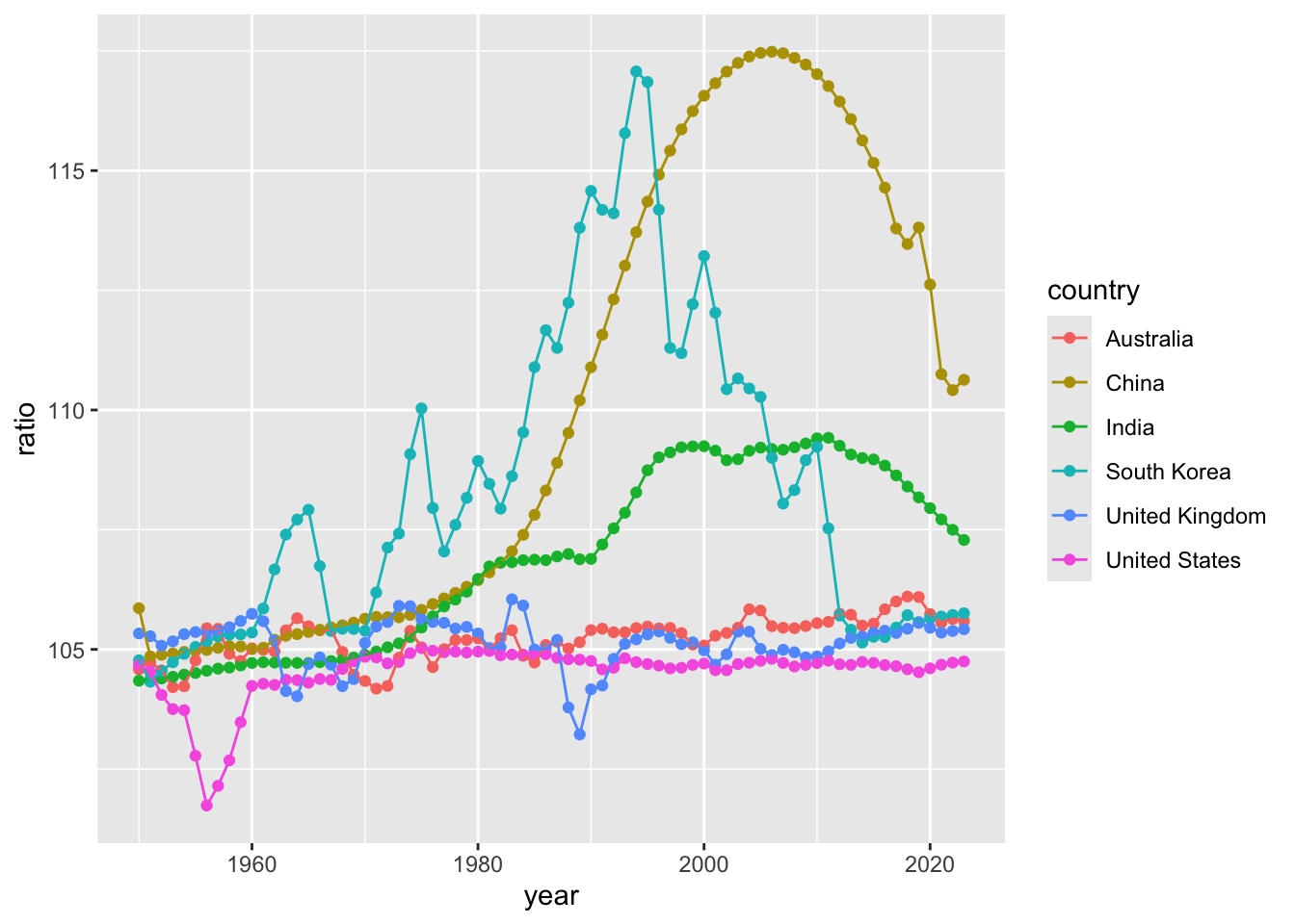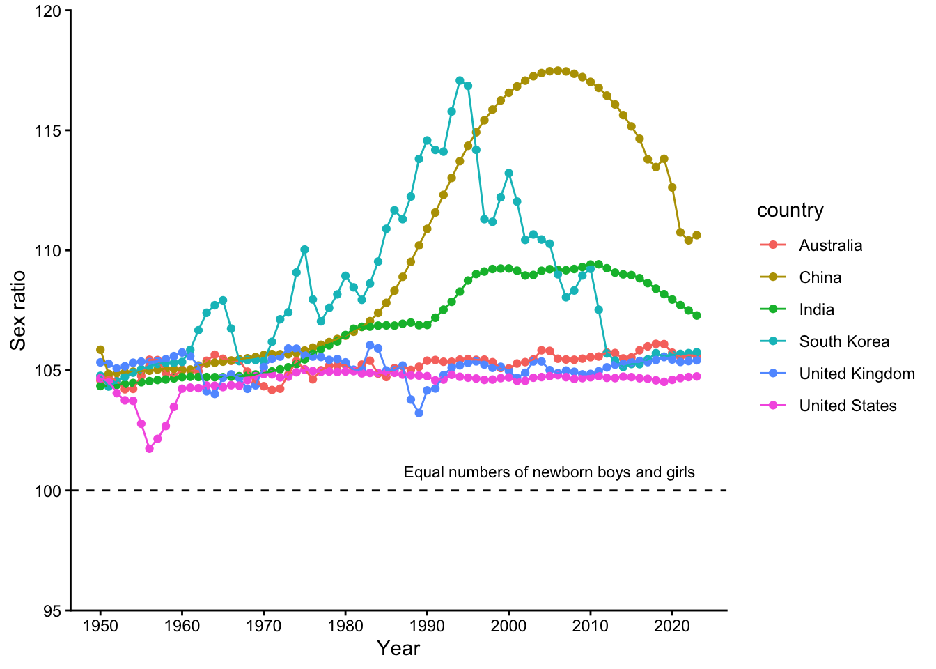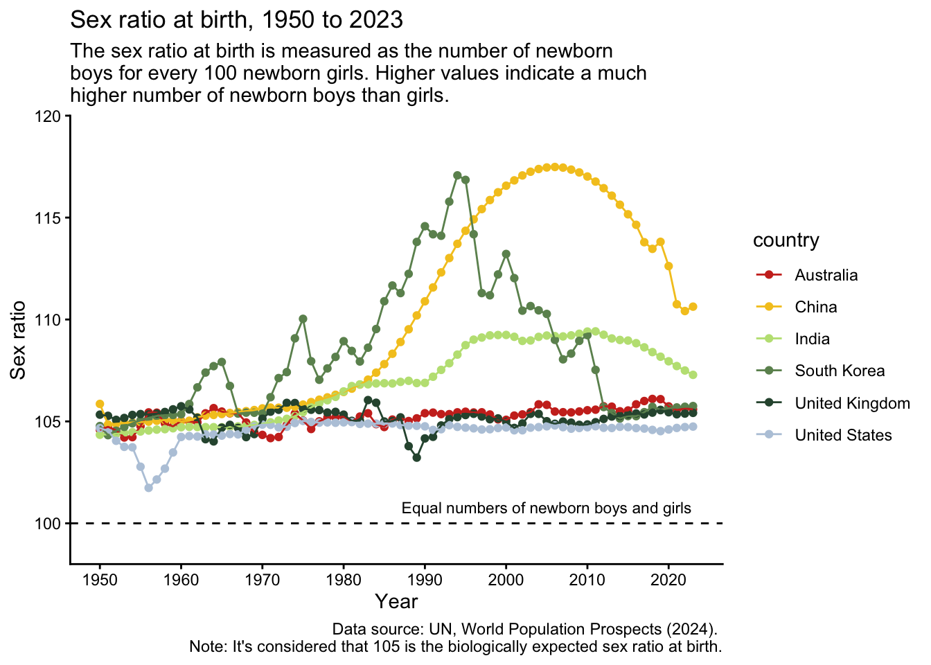 The plots at Our World in Data unpacking changes in sex ratio at birth across the world uncover some interesting outliers. Across the world it is typical for there to be slightly more boys born than girls. The sex ratio at conception is equal but across pregnancy, the risk of miscarriage is slightly higher for female than male fetuses, resulting in an average of 105 male to 100 female live births. But countries like China, India, and South Korea have much higher than average sex ratios.