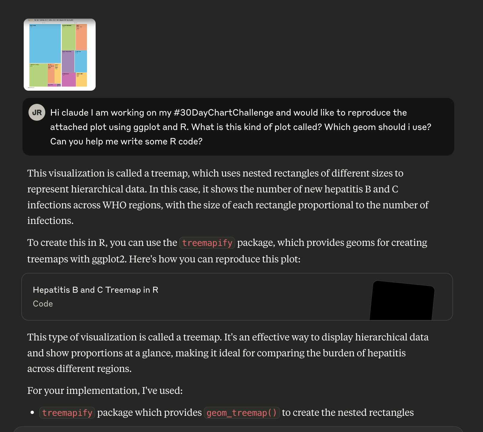 I was surprised that the code that claude wrote ran without throwing an error and made a passable treemap plot. It is actually impressive that the LLM pulled the data and colour palette from the png file I gave it. Of course, if I want to learn about how treemaps work, I should probably start from scratch.