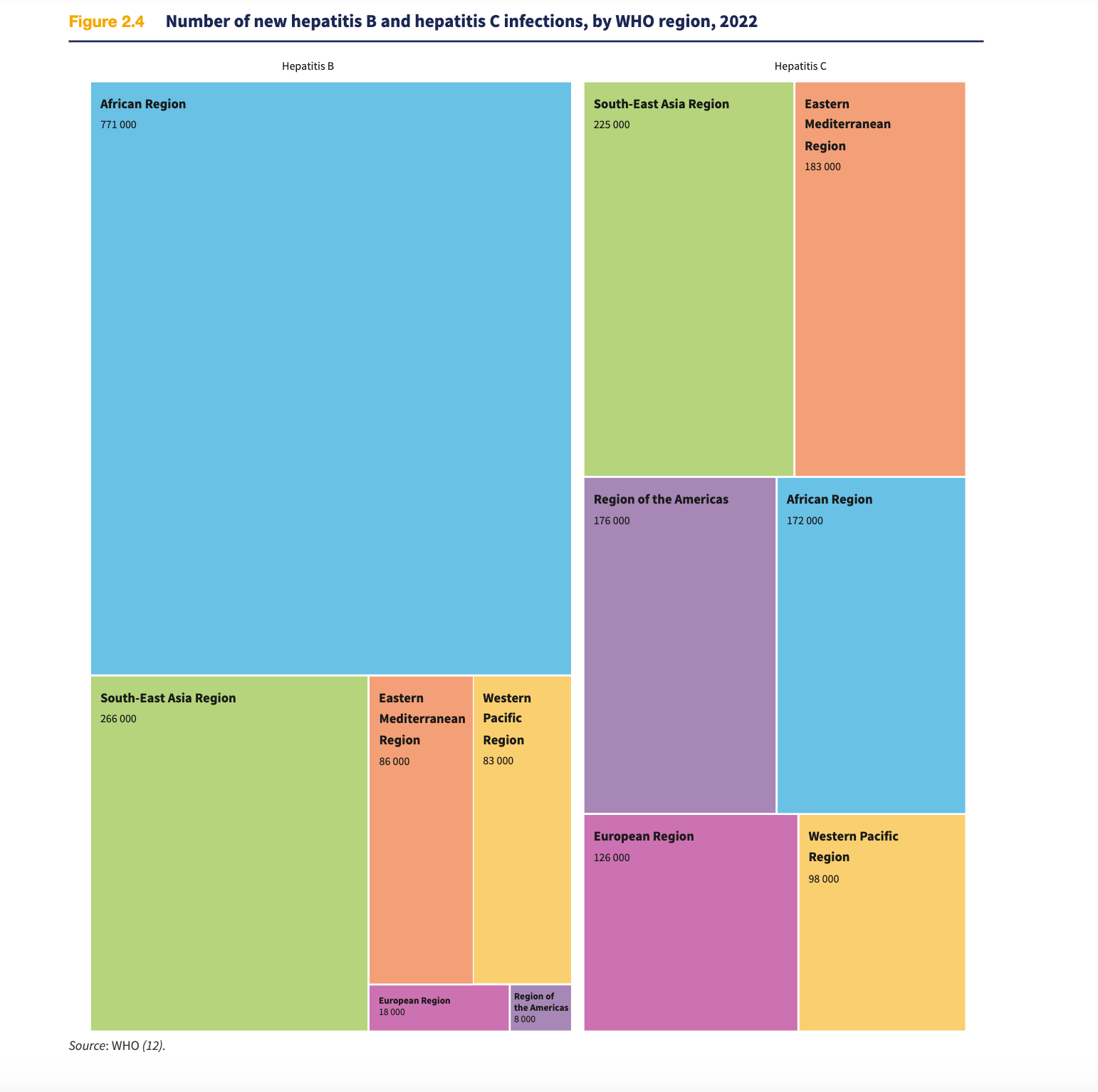 hepB <- hep %>%ggplot(aes(area = new_hepB, fill = WHO_region, layout ="fixed",label =paste(WHO_region, new_hepB, sep ="\n"))) +geom_treemap(colour ="white") +scale_fill_manual(values = palette) +geom_treemap_text(colour ="black",place ="topleft",size =5, grow =FALSE) +# option from ggfittext to NOT make font fit boxeasy_remove_legend() +labs(title ="<span style='color:#F4BD4B;'>Figure 2.4</span><span> Number of new hepatitis B and hepatitis C infections, by WHO region, 2022</span>", subtitle ="Hepatitis B") +theme(plot.subtitle =element_text(hjust =0.5, size =5), plot.title =element_markdown(hjust =0, size =8, face ="bold")) hepC <- hep %>%ggplot(aes(area = new_hepC, fill = WHO_region, layout ="fixed",label =paste(WHO_region, new_hepC, sep ="\n"))) +geom_treemap(colour ="white") +scale_fill_manual(values = palette) +geom_treemap_text(colour ="black",place ="topleft",size =5, grow =FALSE) +# option from ggfittext to NOT make font fit boxeasy_remove_legend() +labs(subtitle ="Hepatitis C") +theme(plot.subtitle =element_text(hjust =0.5, size =5)) hepB + hepC
