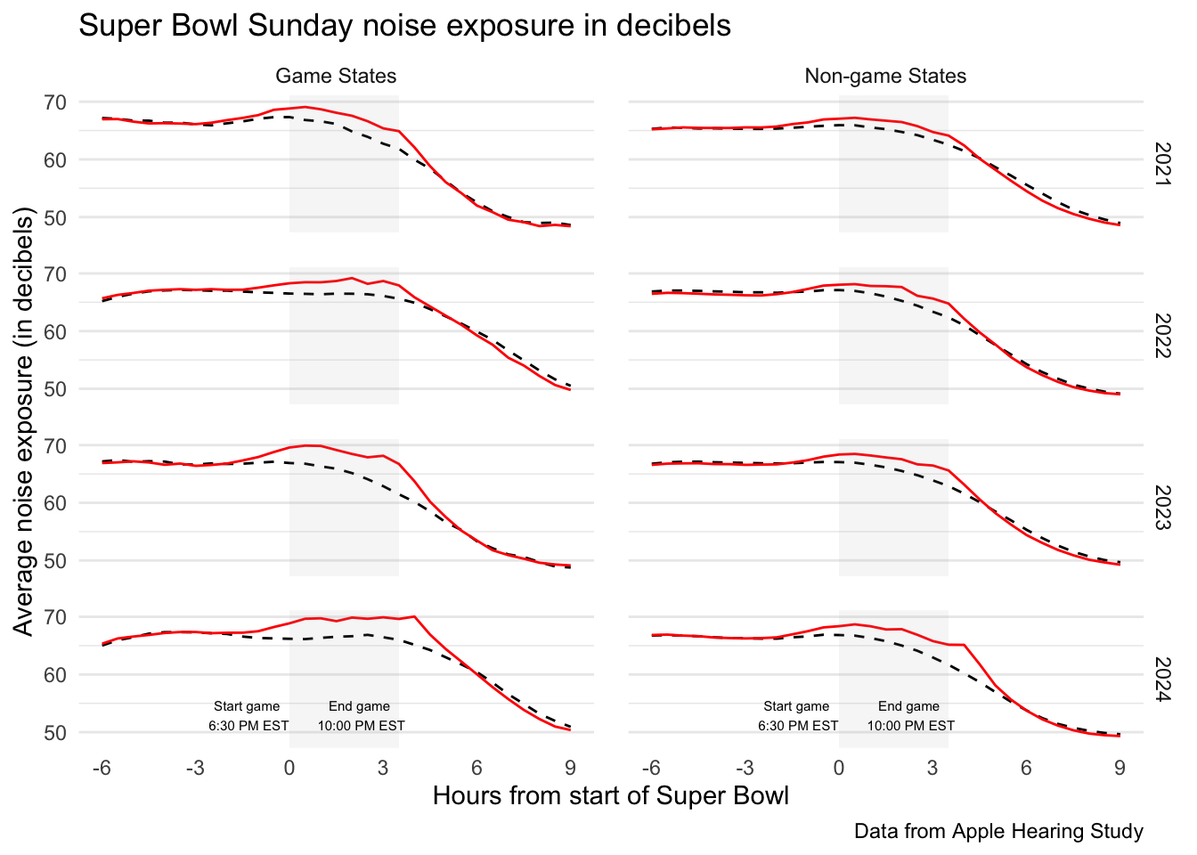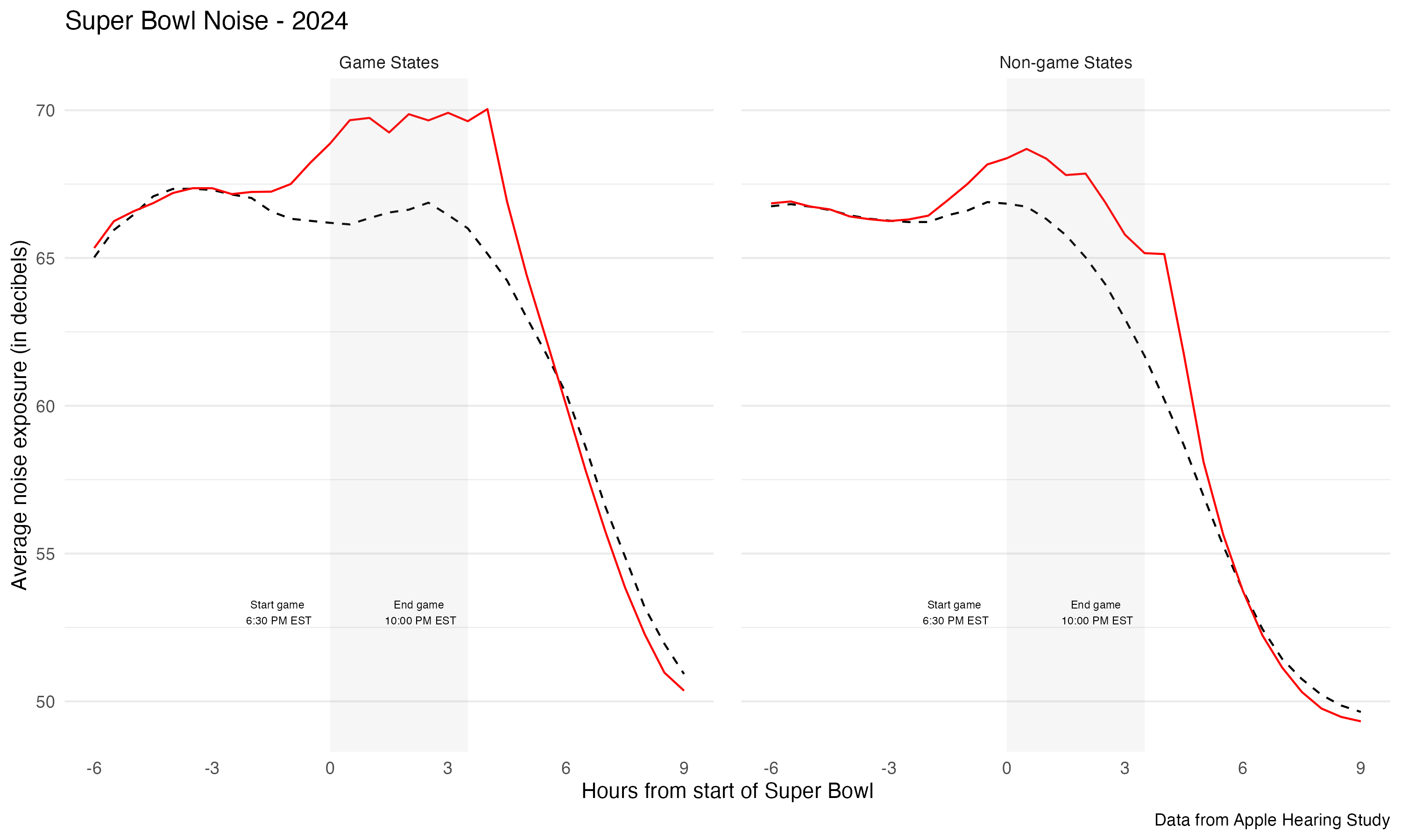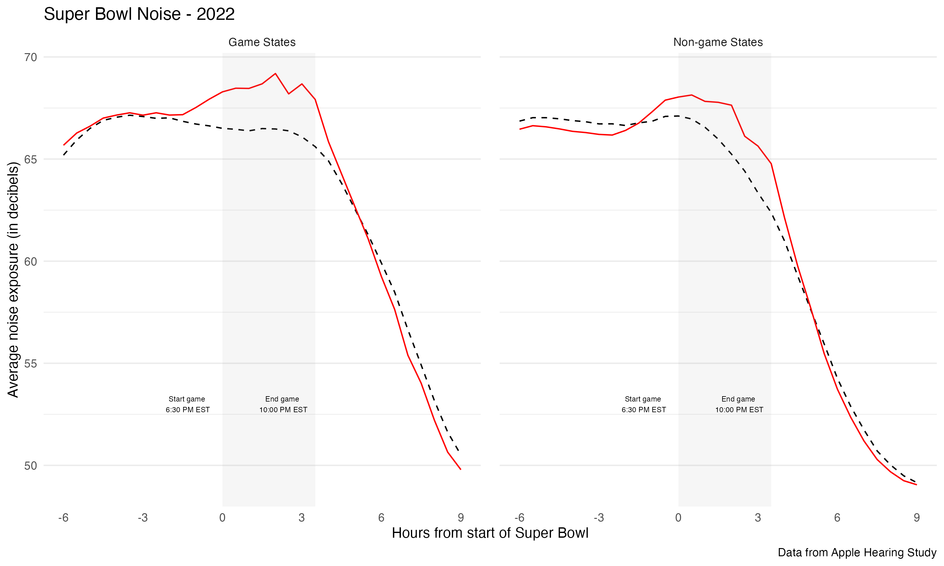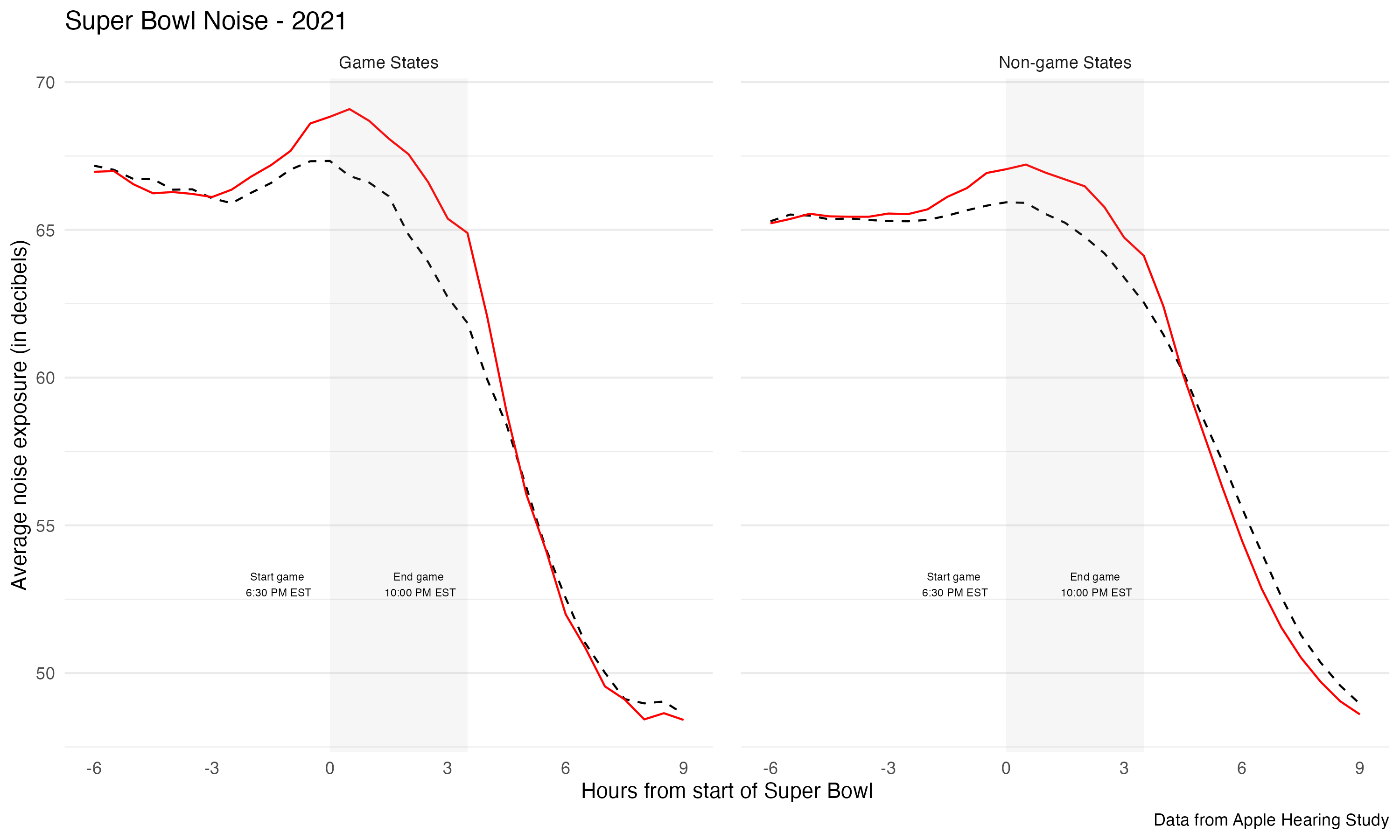 labs( x = "Hours from start of Super Bowl", y = "Average noise exposure (in decibels)", caption = "Data from Apple Hearing Study") +