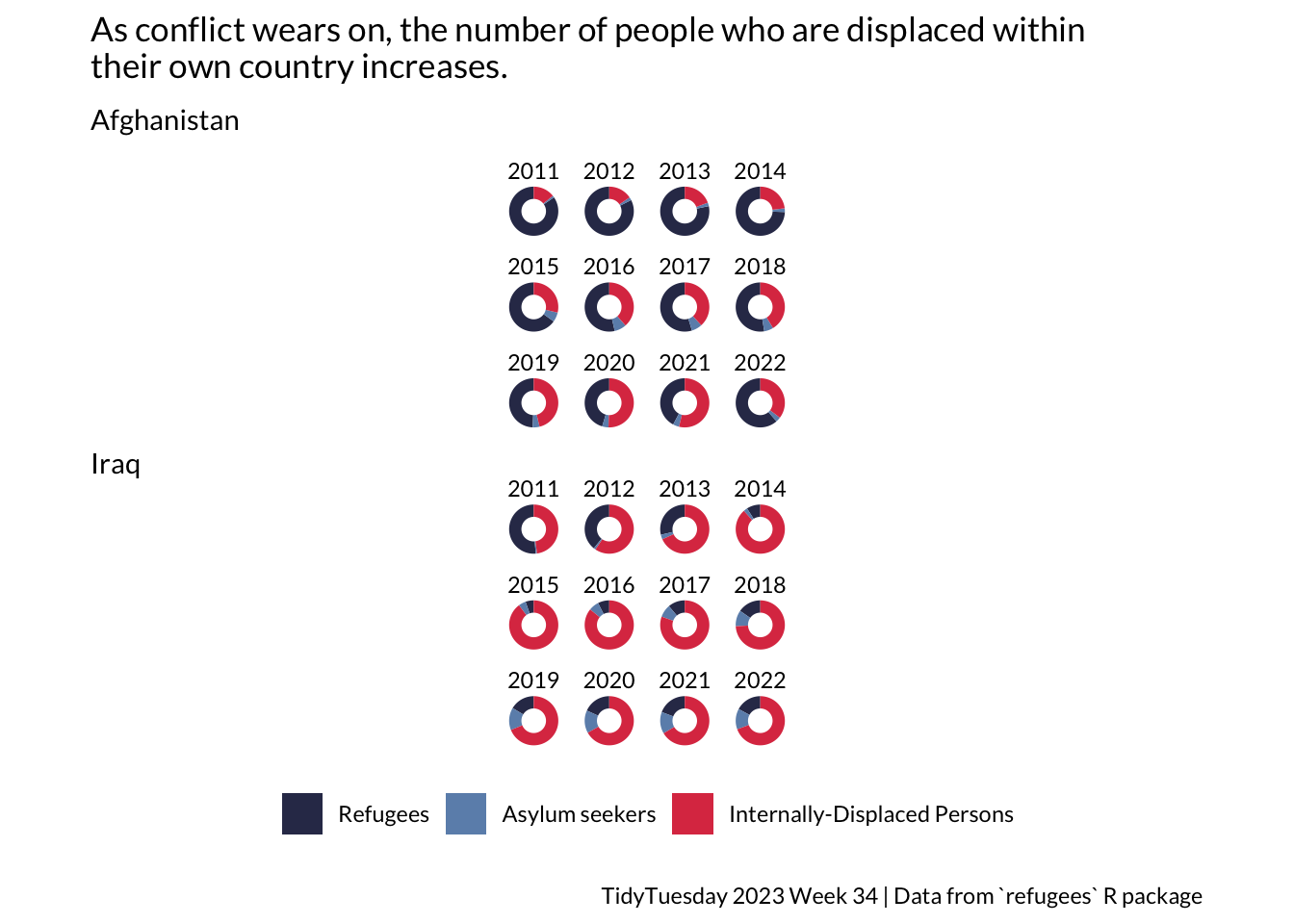 a <- joined %>%filter(coo_name =="Afghanistan", year >2010) %>%ggplot(aes(x =2, y = proportion, fill = type)) +geom_col(width =1) +coord_polar(theta ="y") +xlim(0.5, 2.5) +facet_wrap(~ year, nrow =3) +theme_void(base_family ="Lato") +easy_remove_legend() +scale_fill_manual(values =c("#313657", "#6C90B9", "#DD3C51")) +theme(plot.margin =margin(t =1, r =30, b =1, l =30), ) +labs(title ="As conflict wears on, the number of people who are displaced within \ntheir own country increases.", subtitle ="Afghanistan") +theme(plot.title =element_text(margin =margin(b =10)), plot.subtitle =element_text(margin =margin(b =10)), # space below subtitle # space below title )i <- joined %>%filter(coo_name =="Iraq", year >2010) %>%ggplot(aes(x =2, y = proportion, fill = type)) +geom_col(width =1) +coord_polar(theta ="y") +xlim(0.5, 2.5) +facet_wrap(~ year, nrow =3) +theme_void(base_family ="Lato") +easy_remove_legend_title() +scale_fill_manual(values =c("#313657", "#6C90B9", "#DD3C51")) +theme(plot.margin =margin(t =1, r =30, b =1, l =30), ) +labs(subtitle ="Iraq", caption ="TidyTuesday 2023 Week 34 | Data from `refugees` R package") +theme(plot.caption =element_text(margin =margin(t =10)),legend.position ="bottom",legend.margin =margin(t =10, b =10) # more space around legend )a / i