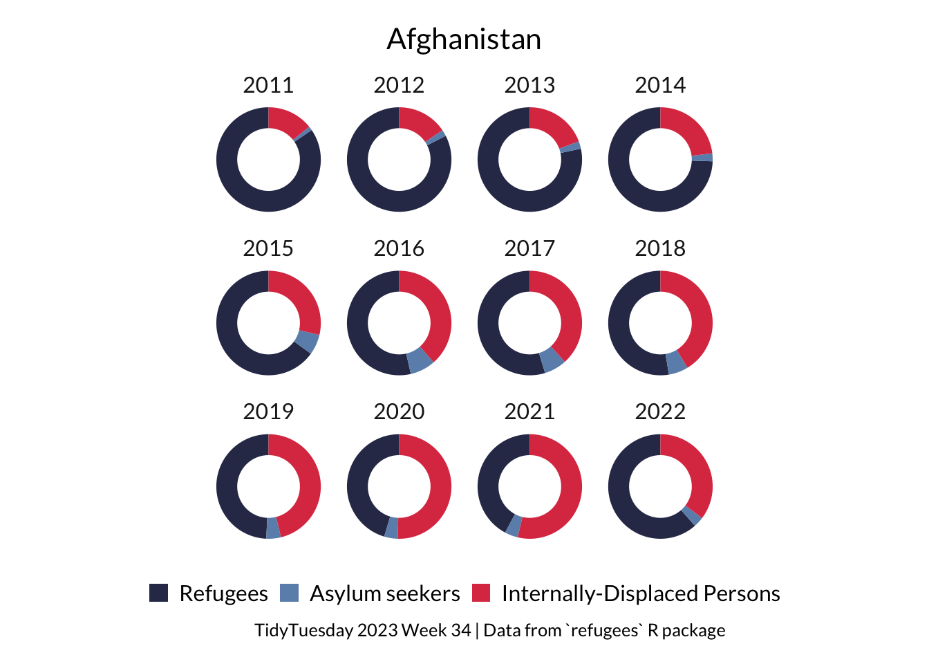 joined %>%filter(coo_name =="Afghanistan", year >2010) %>%tidyplot(y = proportion, colour = type) %>%add_donut() %>%adjust_size(width =25, height =25) |>split_plot(by = year) %>%adjust_font(fontsize =12, family ="Lato") %>%adjust_title("Afghanistan", fontsize =16) %>%adjust_colors(new_colors =c("#313657", "#6C90B9", "#DD3C51")) %>%adjust_legend_position(position ="bottom") %>%remove_legend_title() %>%adjust_caption("TidyTuesday 2023 Week 34 | Data from `refugees` R package") %>%save_plot(here::here("charts26", "2026-04-08_circular", "tidyA.png"))