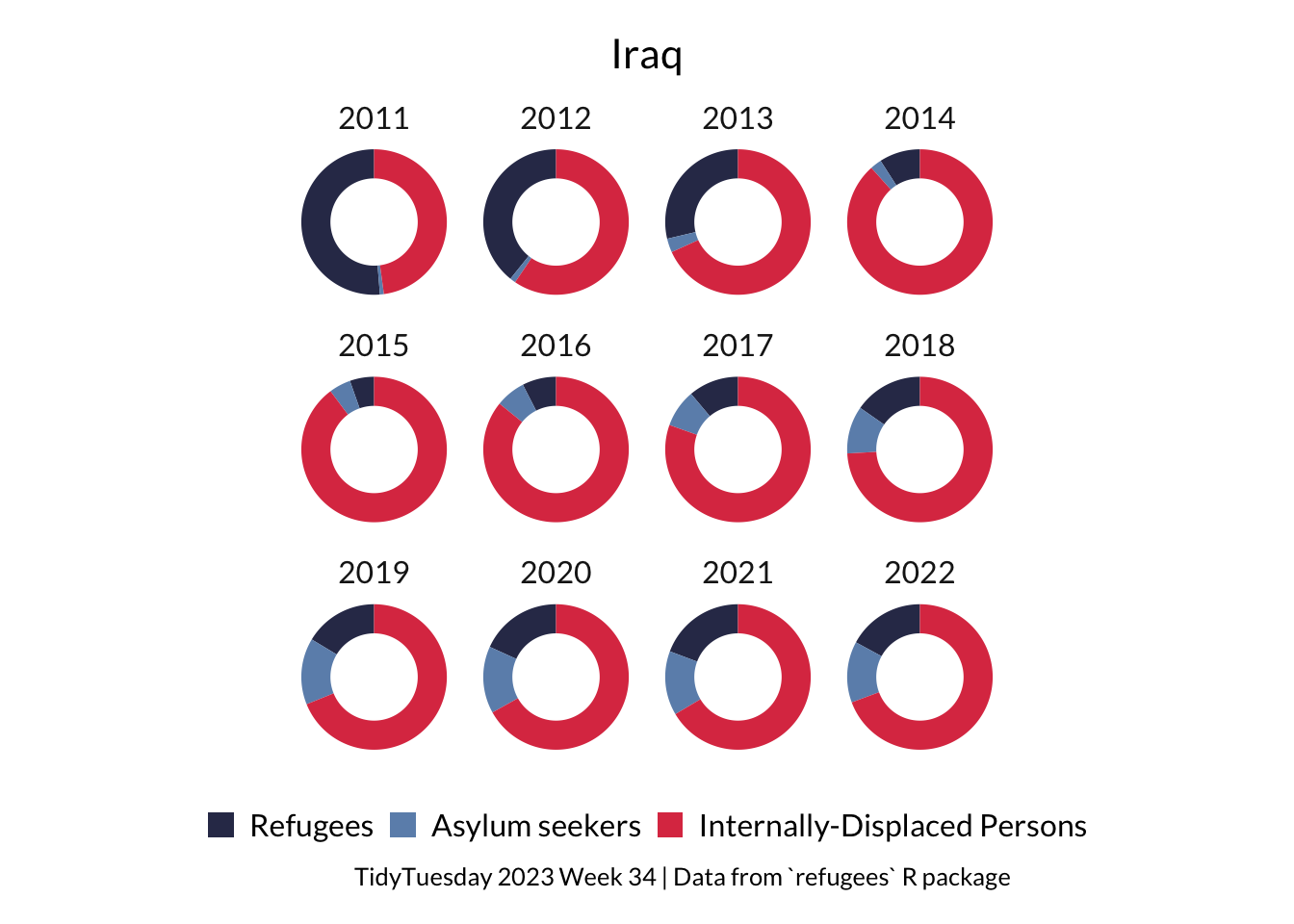 joined %>%filter(coo_name =="Iraq", year >2010) %>%tidyplot(y = proportion, colour = type) %>%add_donut() %>%adjust_size(width =25, height =25) |>split_plot(by = year) %>%adjust_font(fontsize =12, family ="Lato") %>%adjust_title("Iraq", fontsize =16) %>%adjust_colors(new_colors =c("#313657", "#6C90B9", "#DD3C51")) %>%adjust_legend_position(position ="bottom") %>%remove_legend_title() %>%adjust_caption("TidyTuesday 2023 Week 34 | Data from `refugees` R package") %>%save_plot(here::here("charts26", "2026-04-08_circular", "tidyI.png"))