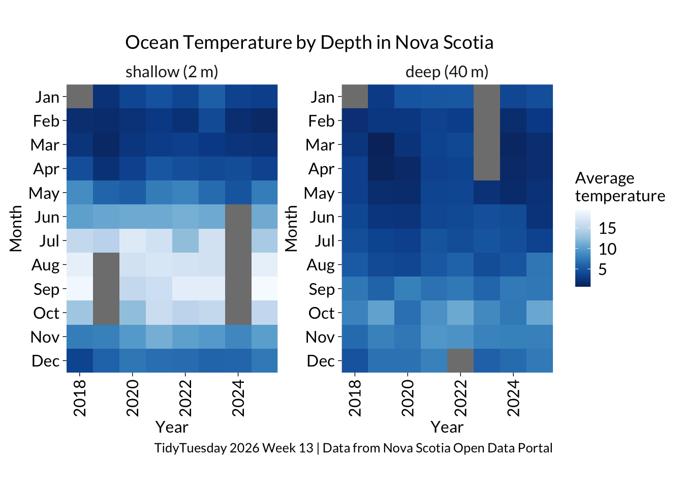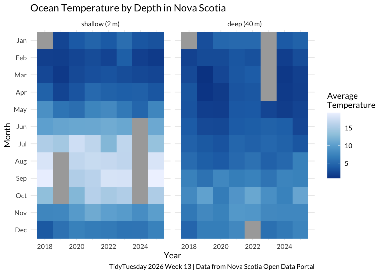 shallow_deep_complete %>%ggplot(aes(x = year, y = month, fill = monthly_mean)) +geom_tile() +facet_wrap(~depth) +theme_minimal(base_family ="Lato") +scale_fill_distiller(palette ="Blues", na.value ="darkgrey",name ="Average \nTemperature") +labs(y ="Month", x ="Year", title ="Ocean Temperature by Depth in Nova Scotia", caption ="TidyTuesday 2026 Week 13 | Data from Nova Scotia Open Data Portal")