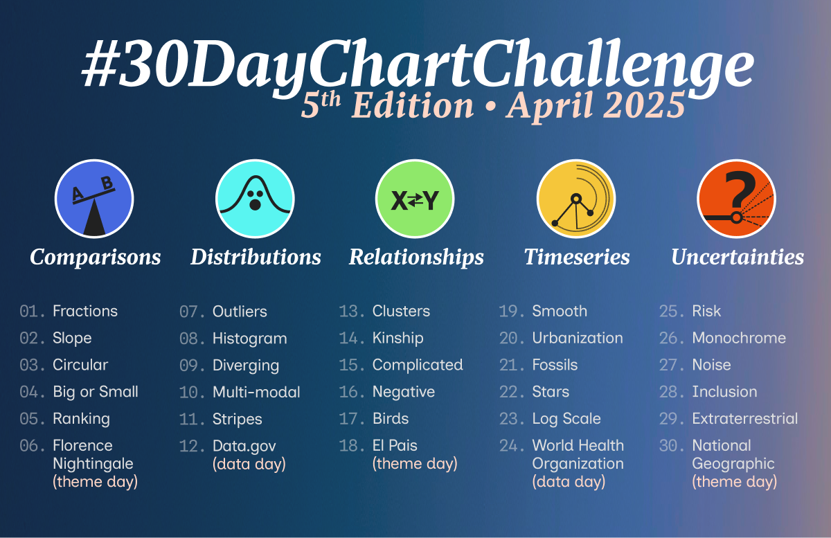 I love data viz! I made the charts in this portfolio as part of the #30DayChartChallenge in April 2025.