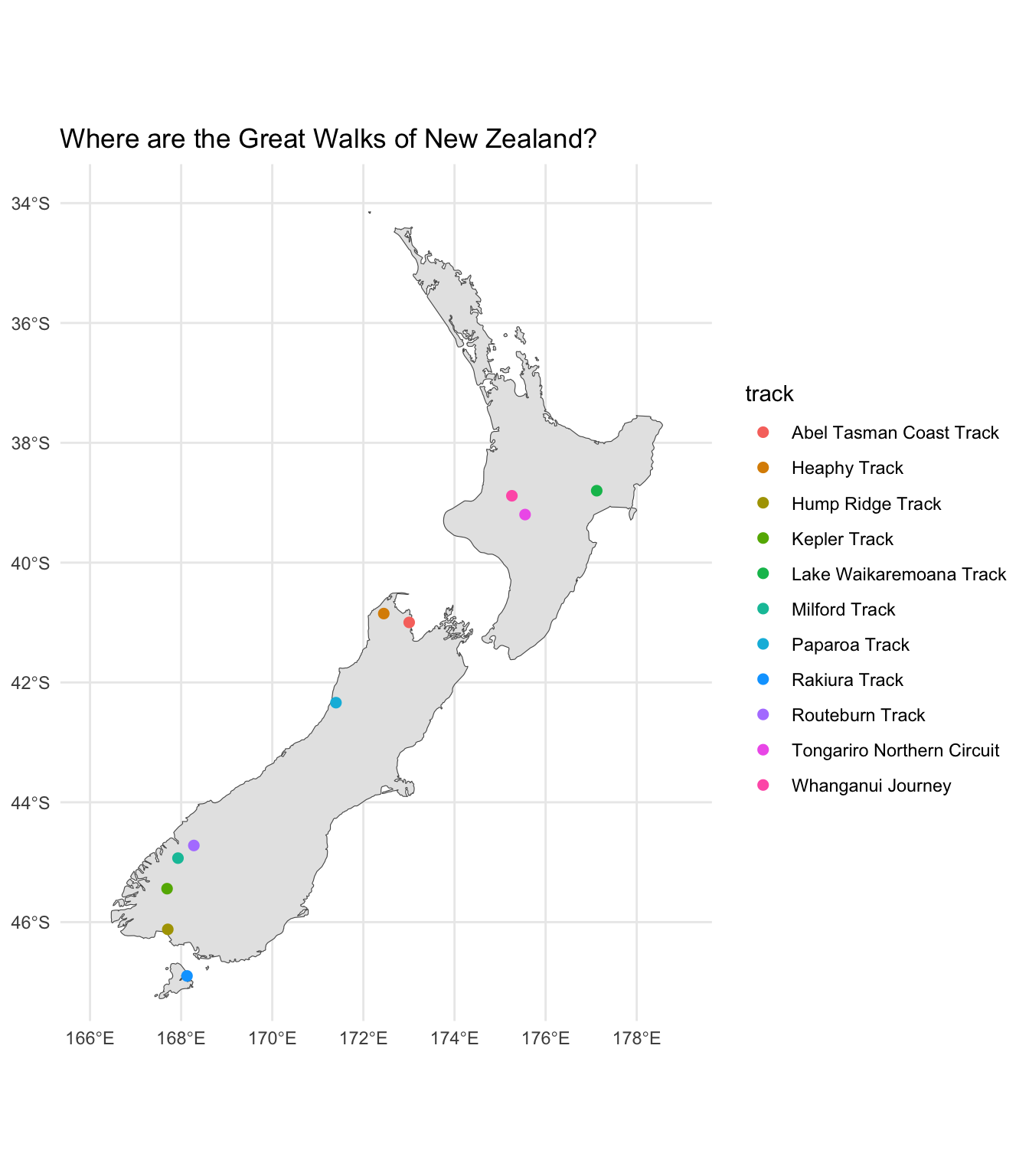 I am supposed to be hiking the Routeburn Track next week (if the waist-deep snow melts and the Harris Saddle is open) so thought I would start the #30DayMapChallenge with some data about New Zealand Great Walks.