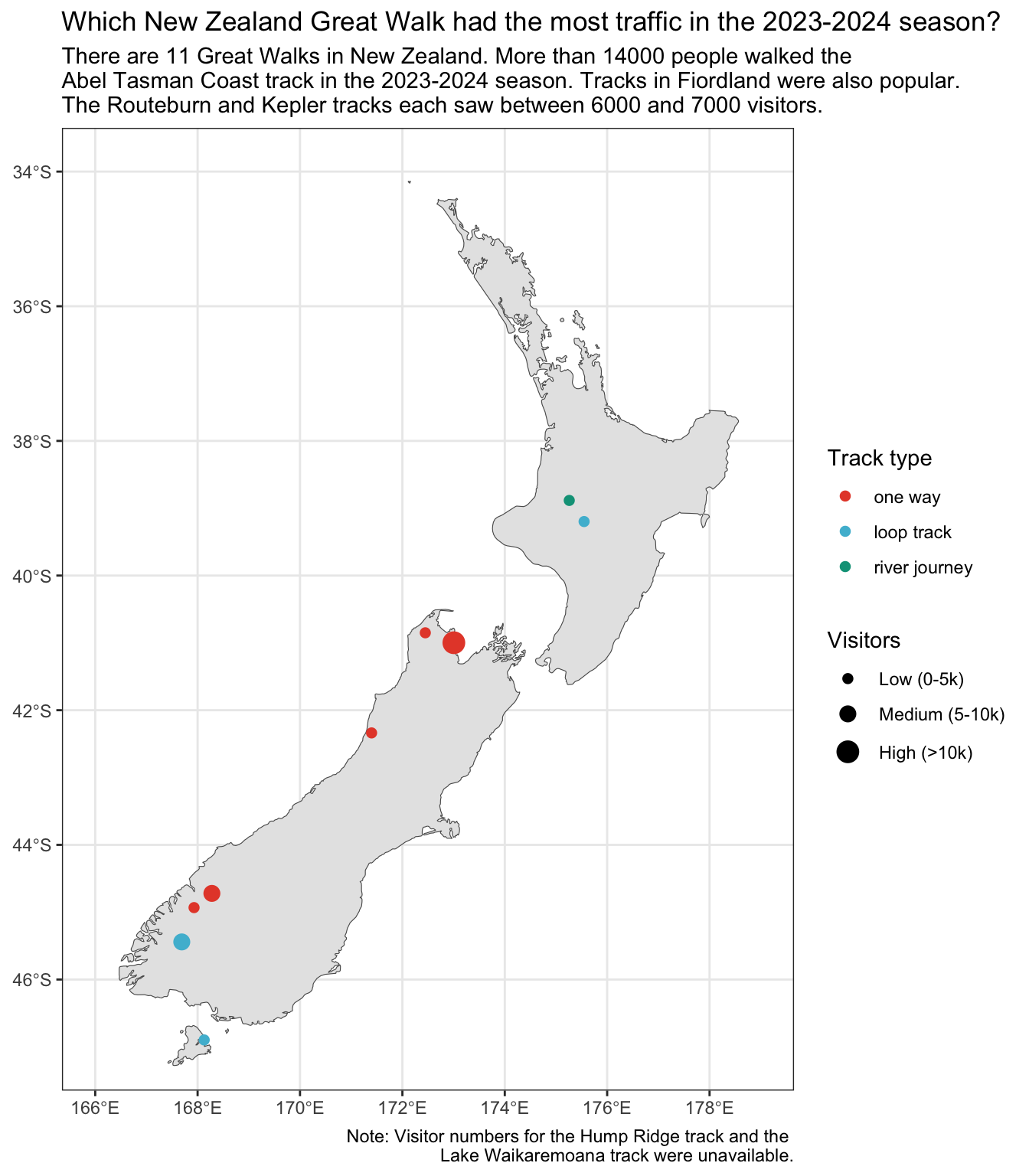 # then plot from 23-24 season from bookings joined data, only have booking data for 9 tracksggplot() +geom_sf(data = nz) +geom_point(data = total23_24, aes(x = start_long, y = start_lat, colour = track_format, size = booking_category), shape =20) +coord_sf(xlim =c(166, 179), ylim =c(-47, -34)) +theme_bw() +scale_size_manual(values =c(3, 5, 7), name ="Visitors") +easy_remove_axes(which =c("both"), what =c("title")) +scale_color_npg() +easy_add_legend_title("Track type") +guides(color =guide_legend(override.aes =list(size =3))) +# Larger dots in the legendlabs(title ="Which New Zealand Great Walk had the most traffic in the 2023-2024 season?", subtitle ="There are 11 Great Walks in New Zealand. More than 14000 people walked the \nAbel Tasman Coast track in the 2023-2024 season. Tracks in Fiordland were also popular. \nThe Routeburn and Kepler tracks each saw between 6000 and 7000 visitors.", caption ="Note: Visitor numbers for the Hump Ridge track and the \nLake Waikaremoana track were unavailable.")