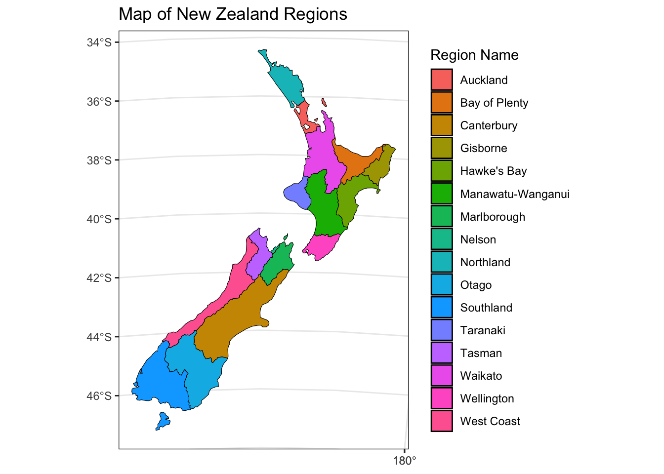 ggplot(data = nz) +geom_sf(aes(fill = Name), color ="black") +labs(title ="Map of New Zealand Regions", fill ="Region Name") +theme_bw()