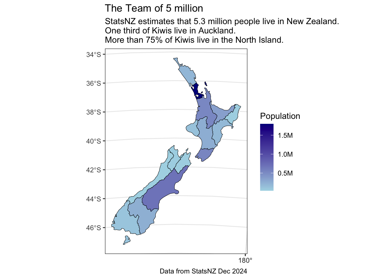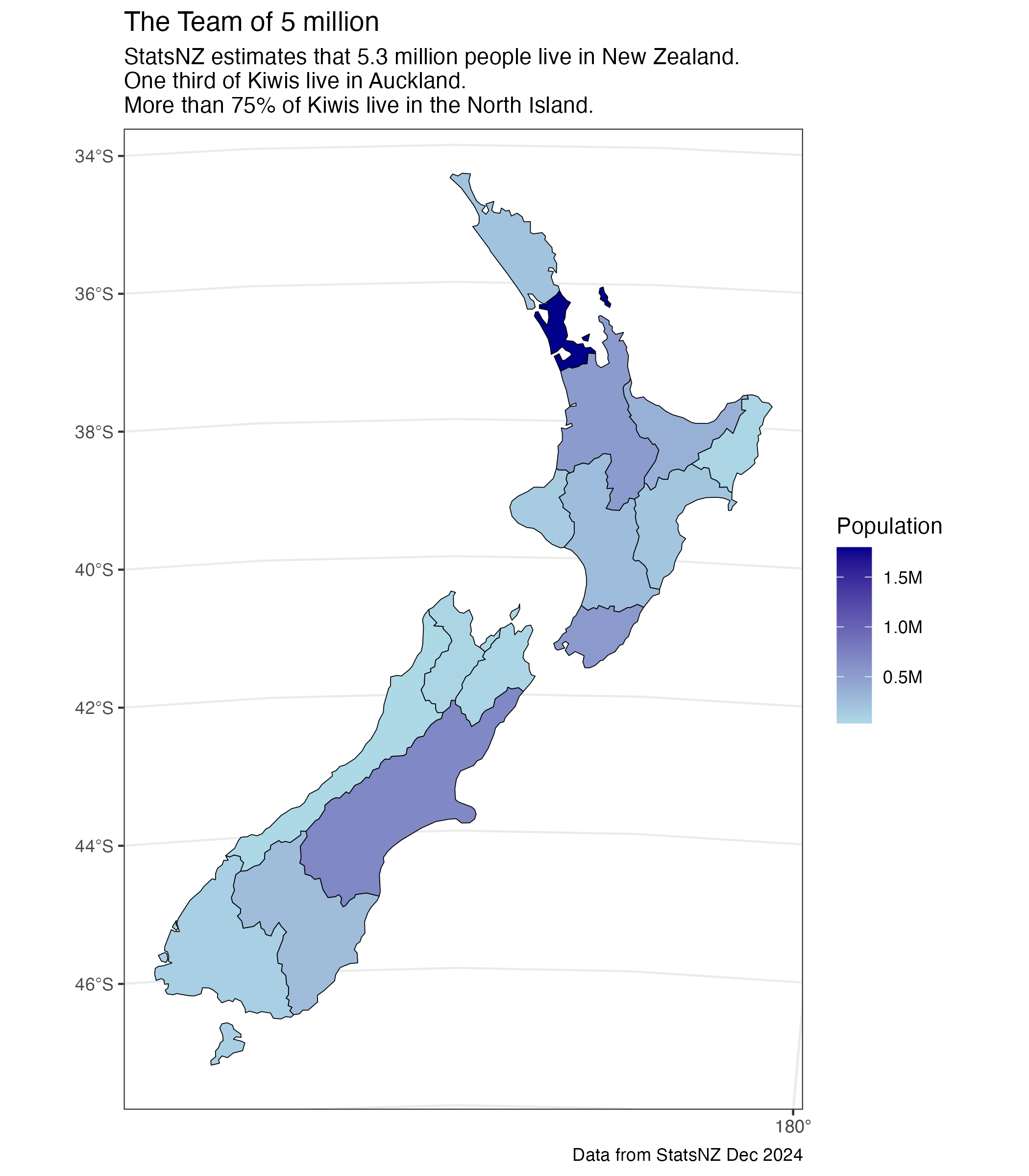 ggplot(data = nzpop24) +geom_sf(aes(fill = Population24), color ="black") +# Fill by region name and add black borderslabs(title ="The Team of 5 million", fill ="Population", subtitle ="StatsNZ estimates that 5.3 million people live in New Zealand. \nOne third of Kiwis live in Auckland. \nMore than 75% of Kiwis live in the North Island.", caption ="Data from StatsNZ Dec 2024") +scale_fill_gradient(low ="lightblue", high ="darkblue", labels =label_number(scale =1e-6, suffix ="M")) +theme_bw()