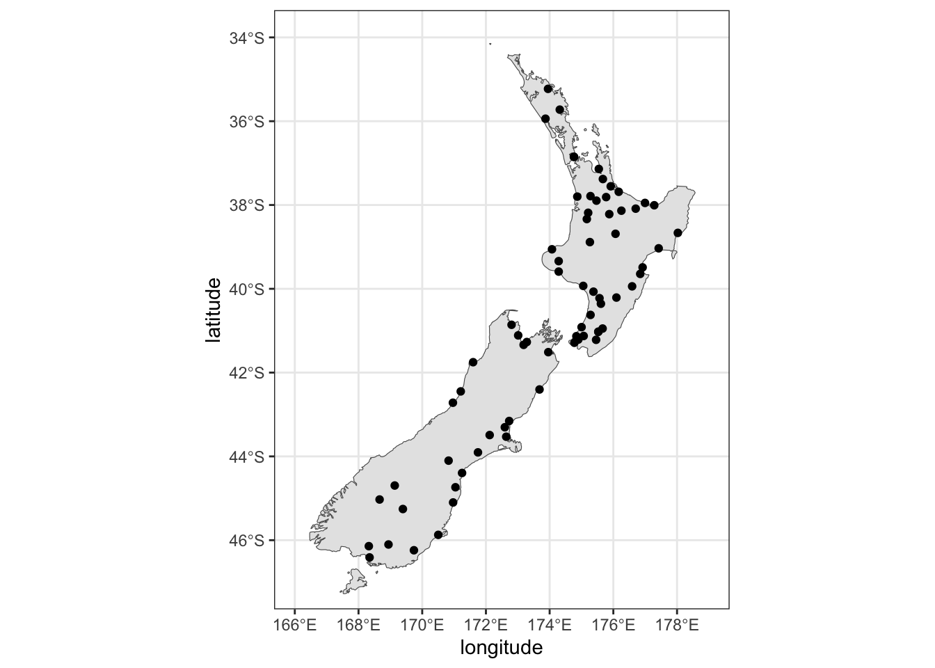 But if you want regional information on your plot, you need to battle wih spData. Here I ran into problems that required converting the nz map to lat/long and then converting point locations to sf.