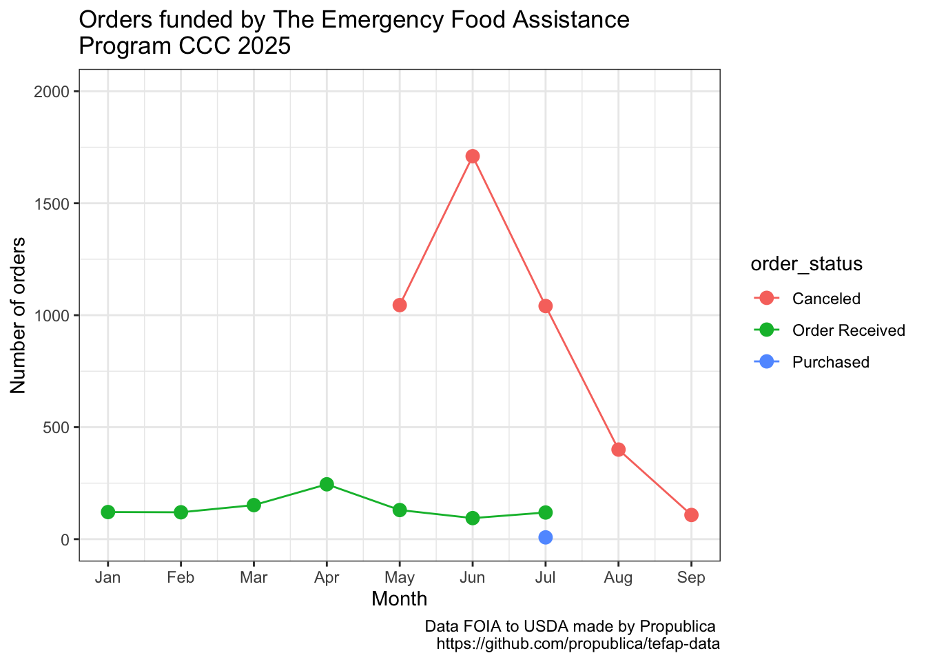 On BlueSky this afternoon I came across some data that ProPublica were sharing on github about cancelled food orders funded by The Emergency Food Assistance Program (TEFAP). TEFAP is a USDA program that funds the distribution healthy food (meat, eggs, dairy, fruit/vege) from US suppliers to food banks, who pass it along to vulnerable people in communities across the country. Propublica had made a Freedom of Information Act (FOIA) request to USDA about cancelled food orders and written up this nice scrollytelling piece about the 94 million pounds of food orders that have been cancelled since June by the Trump administration.