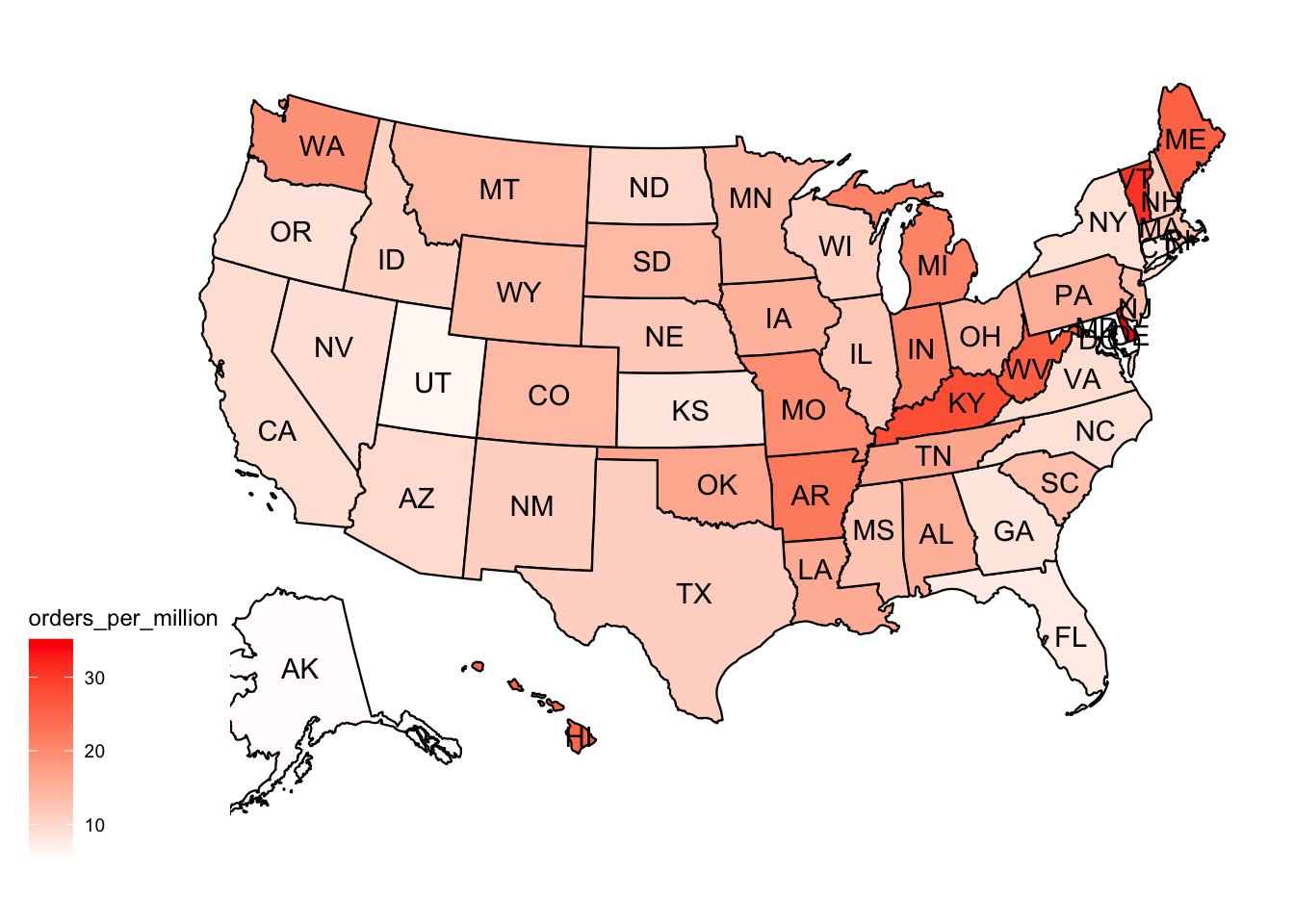 orders_per_million = orders_cancelled/millions)When represented as the number of orders cancelled per million population, it is clear that red states are being adversely affected by this funding cut.