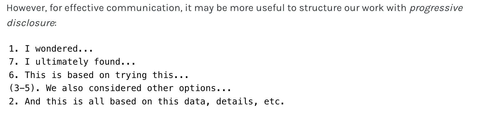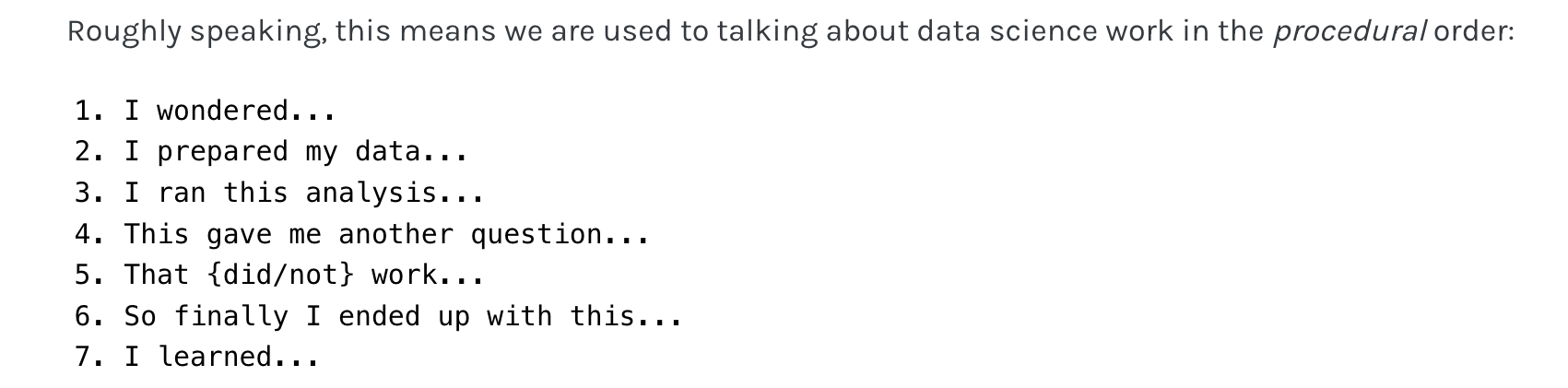 Emily Riederer wrote a great blog post this week about storytelling in data science. Her take home was that that often we tell data stories in procedural order like this…